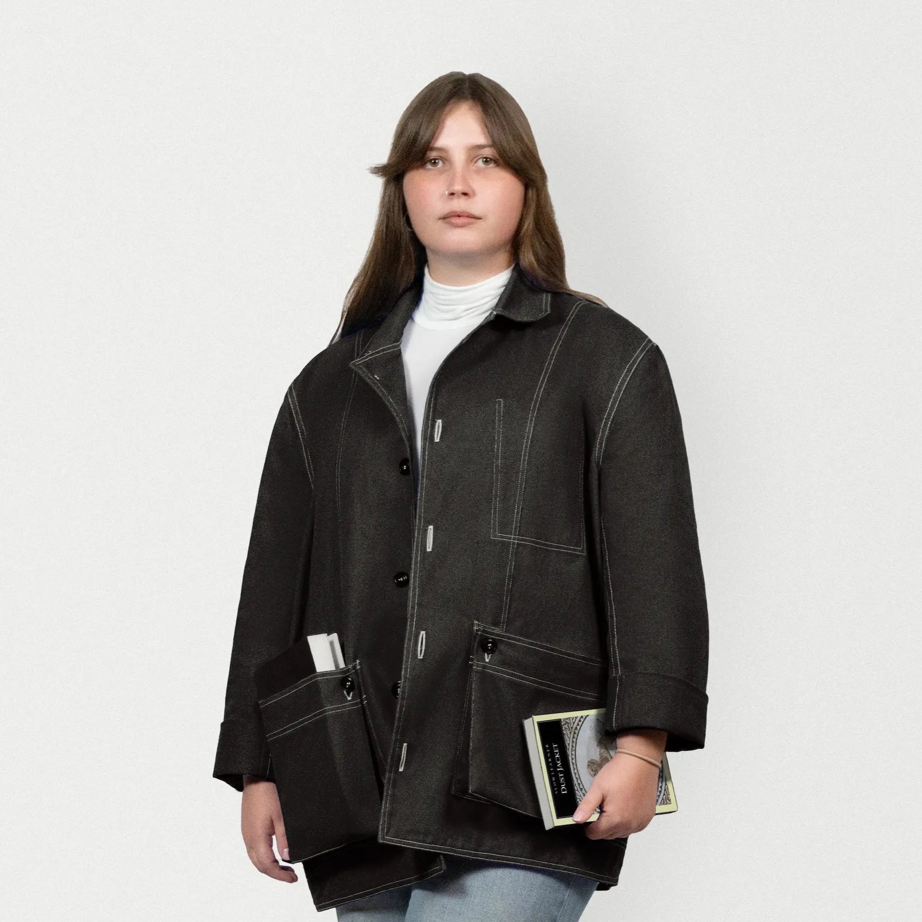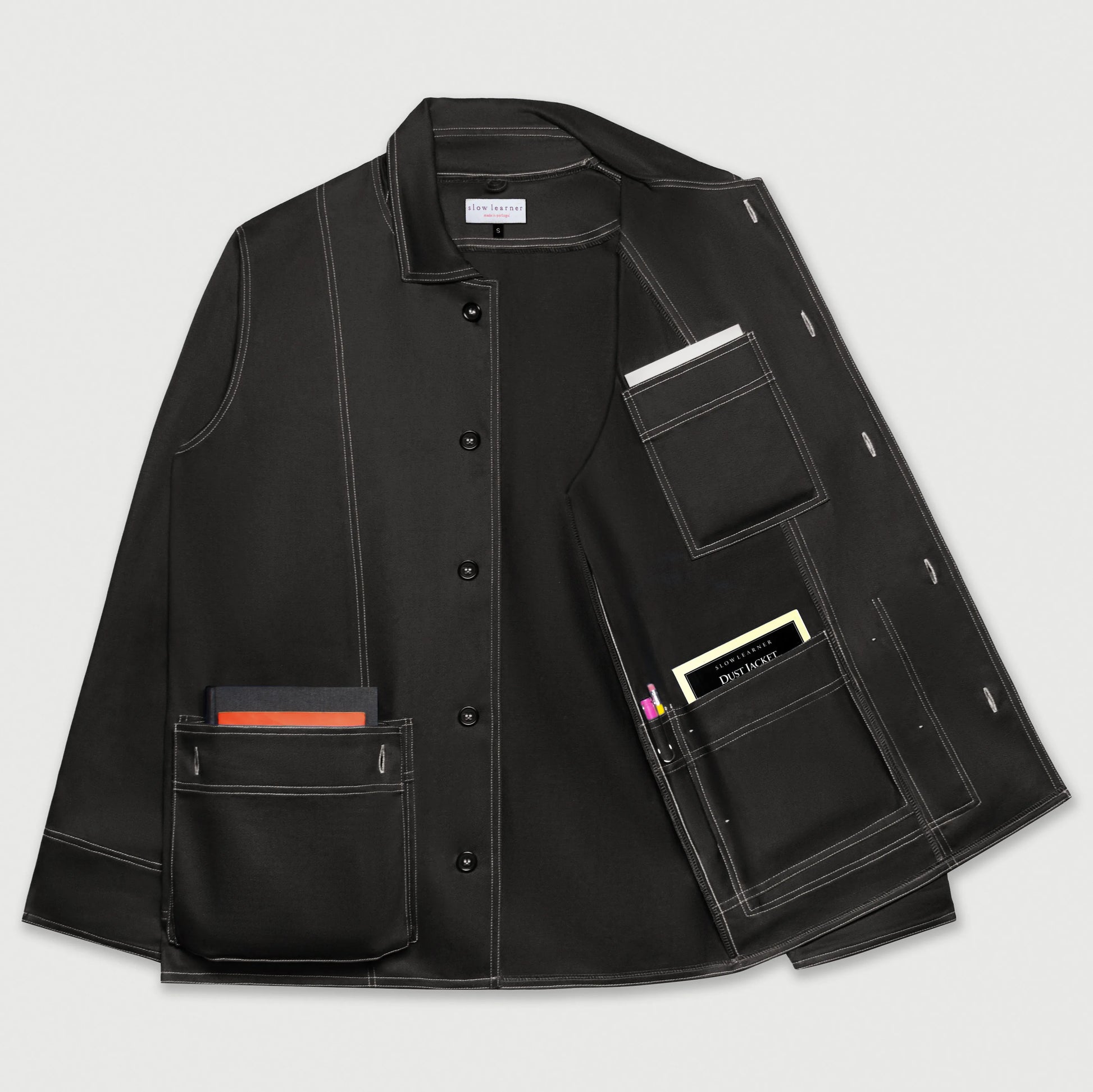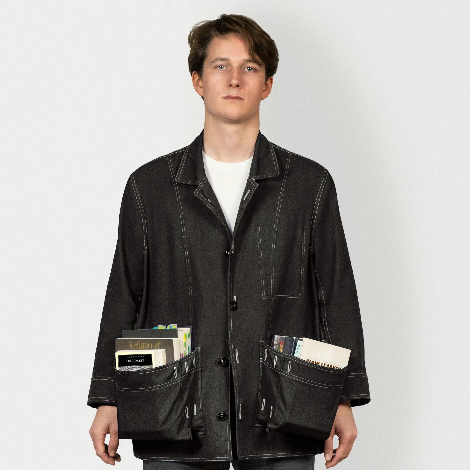 fill your pockets with books. the dust jacket repurposes timeless workwear as idlewear. made in portugal for reading, meandering and repose