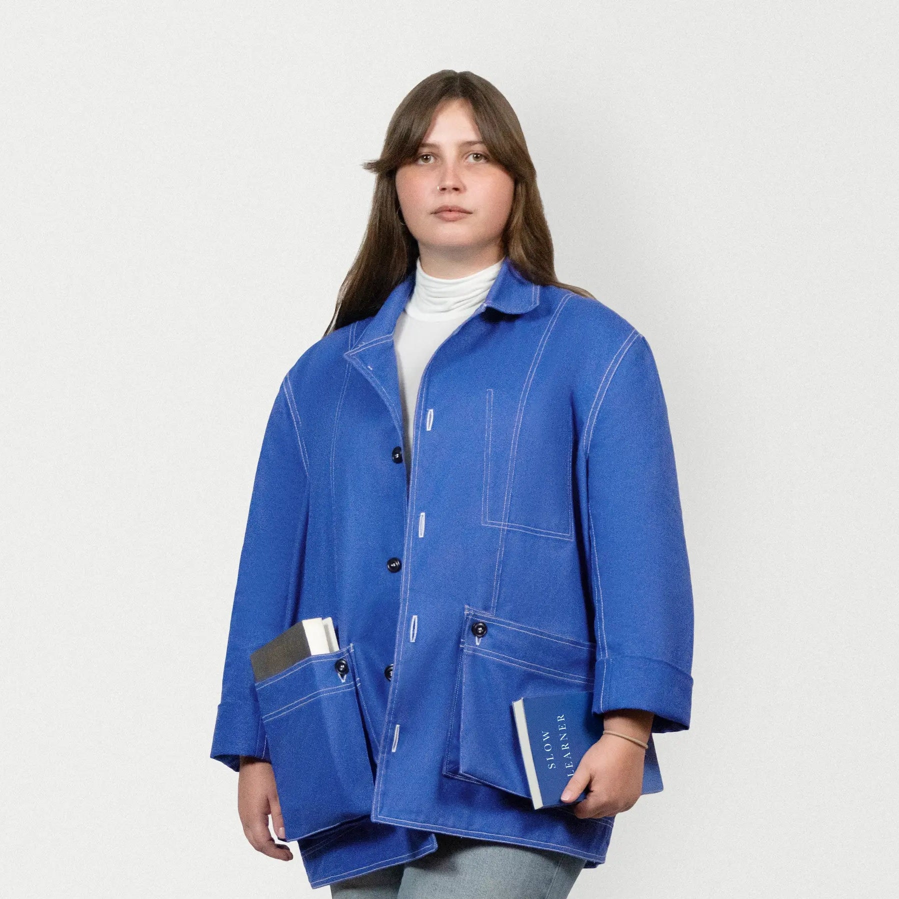 fill your pockets with books. the dust jacket repurposes timeless workwear as idlewear. made in portugal for reading, meandering and repose